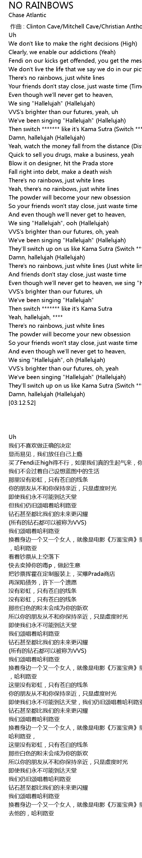 | [02:07.63] | There's no rainbows, just white lines (Just white lines) |