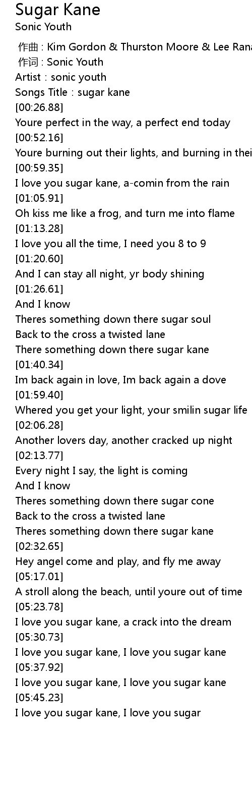 | [05:38.92] | I love you sugar kane, I love you sugar kane |