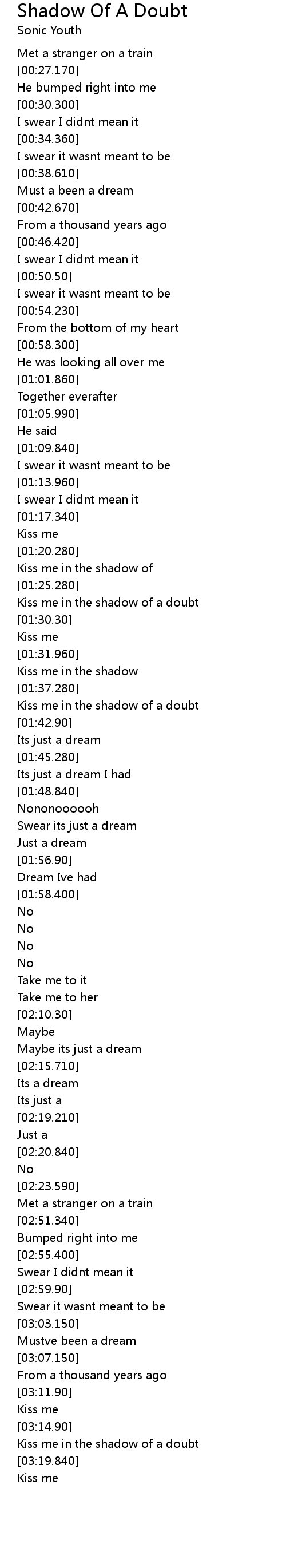 | [01:38.960] | Kiss me in the shadow of a doubt |