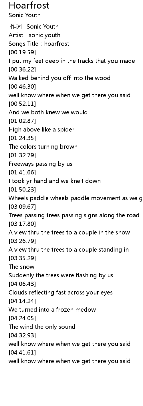 | [03:21.98] | A view thru the trees to a couple in the snow |