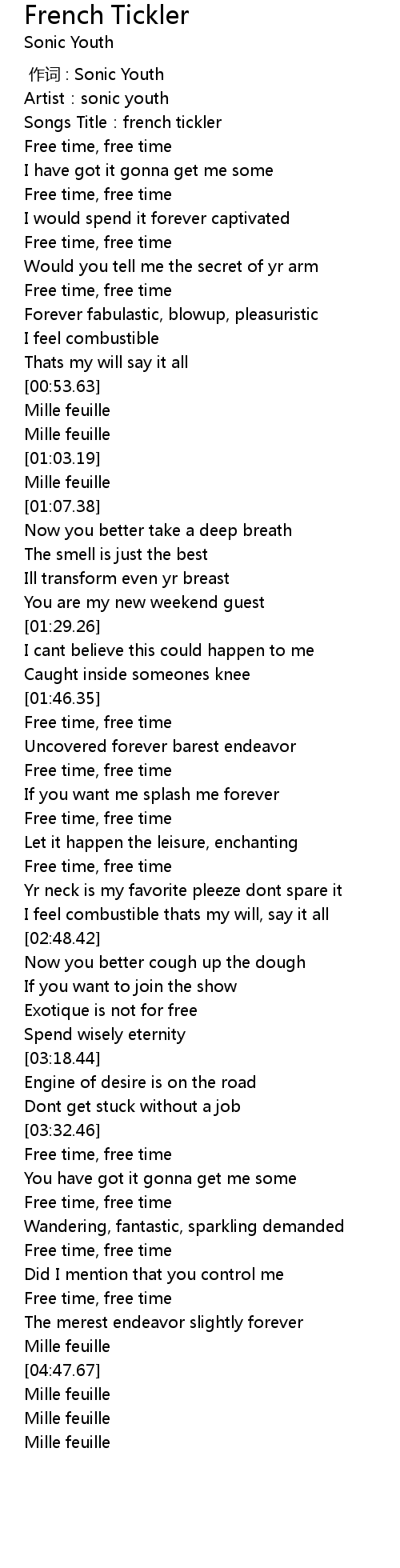 | [00:04.63] | Songs Title: french tickler |