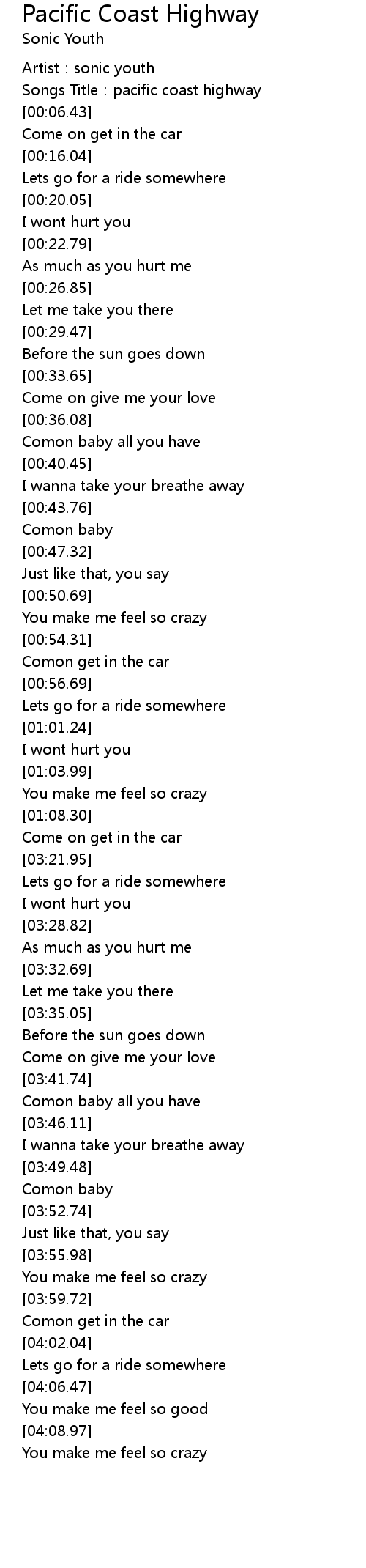| [00:02.74] | Songs Title: pacific coast highway |
