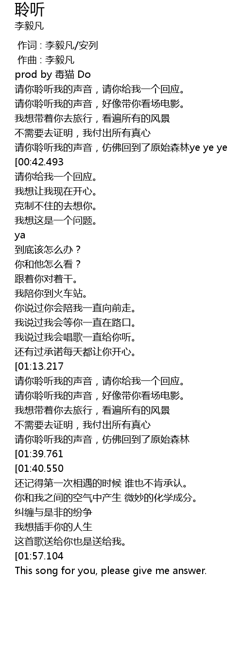 | [01:15.225] | 请你聆听我的声音,请你给我一个回应。 |