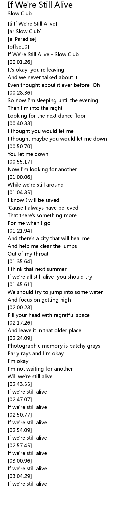 | [00:00.08] | If We're Still Alive - Slow Club |