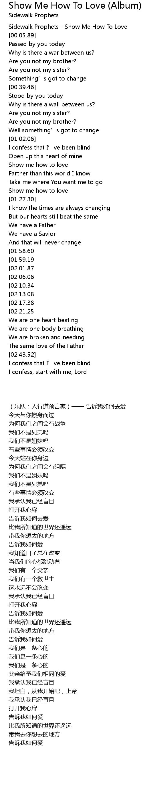 | [00:01.12] | Sidewalk Prophets - Show Me How To Love |