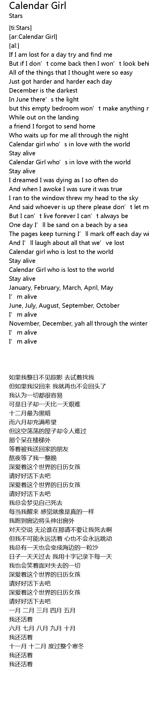 | [01:45.13] | Calendar girl who' s in love with the world |