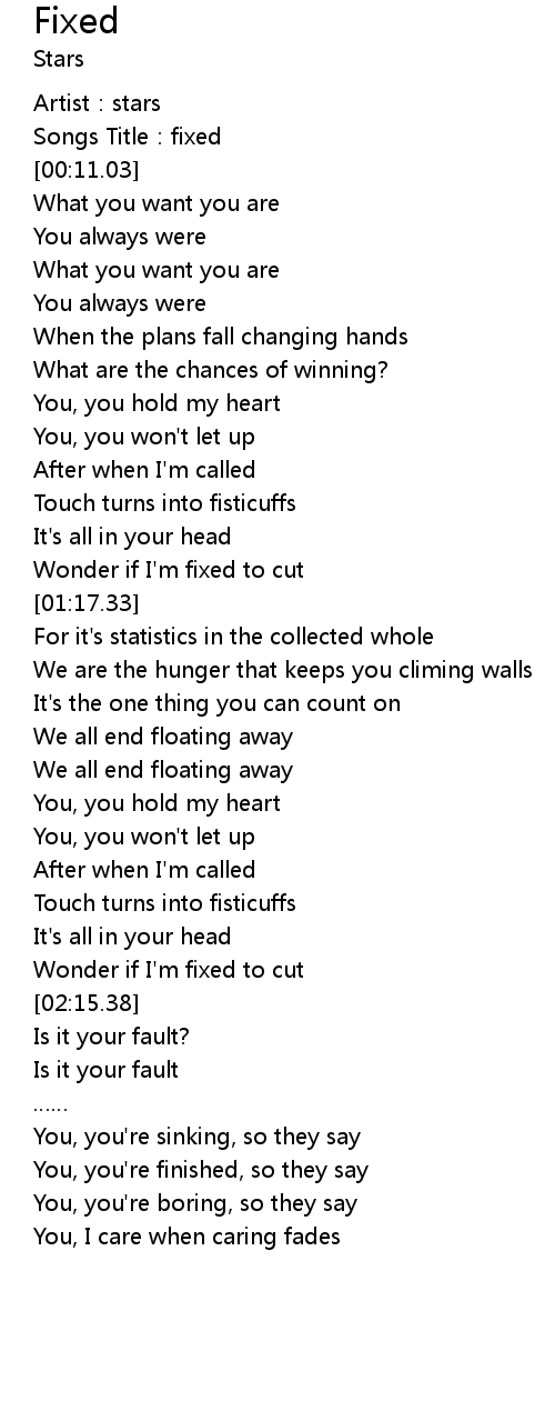 | [02:09.19] | Wonder if I' m fixed to cut |
