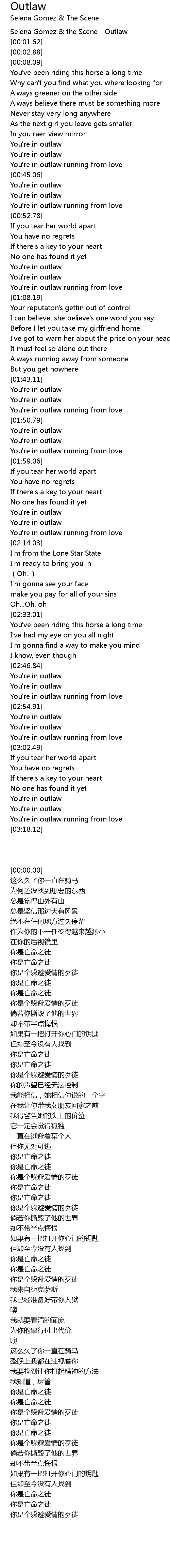 | [00:00.00] | Selena Gomez & the Scene - Outlaw |