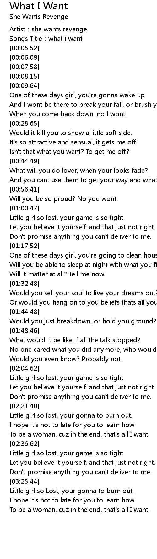 | [00:01.03] | Artist: she wants revenge |
