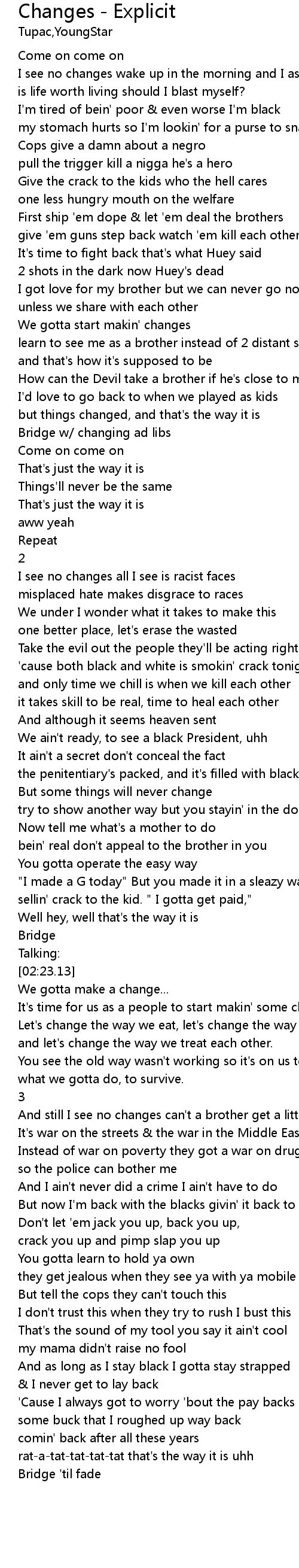 | [03:09.14] | And still I see no changes can't a brother get a little peace |