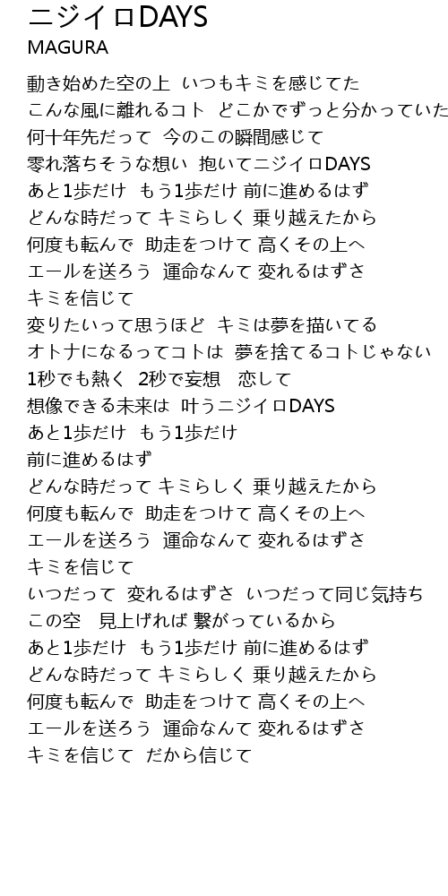 | [00:49.21] | あと1歩だけ もう1歩だけ 前に進めるはず |