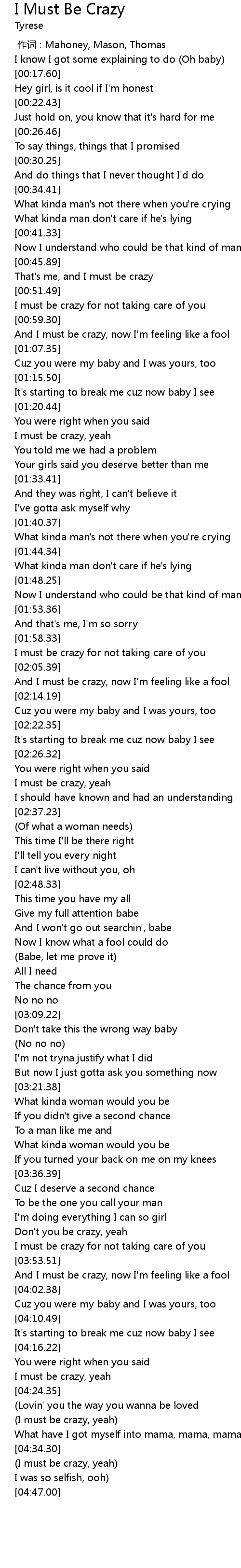 | [01:01.20] | And I must be crazy, now I' m feeling like a fool |