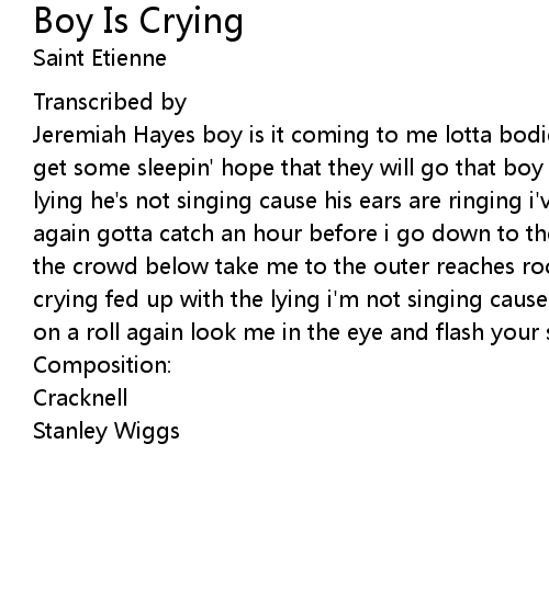 Jeremiah Hayes boy is it coming to me lotta bodies i don't know hoped i could get some sleepin' hope that they will go that boy is crying forget about the lying he's not singing cause his ears are ringing i've gotta hit the sheets again gotta catch an hour before i go down to the streets beneath me out into the crowd below take me to the outer reaches rock me to and fro this boy is crying fed up with the lying i'm not singing cause my eyes are stinging get me on a roll again look me in the eye and flash your smile flash your smile ??? |
