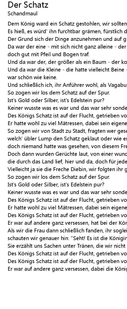 | Dem K nig ward ein Schatz gestohlen, wir sollten ihn ihm wiederholen. | |