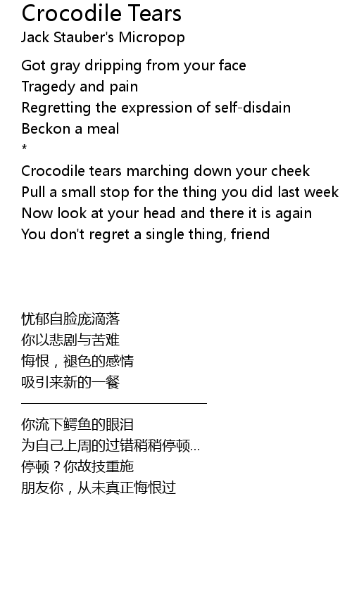 | [00:15.73] | Crocodile tears marching down your cheek |