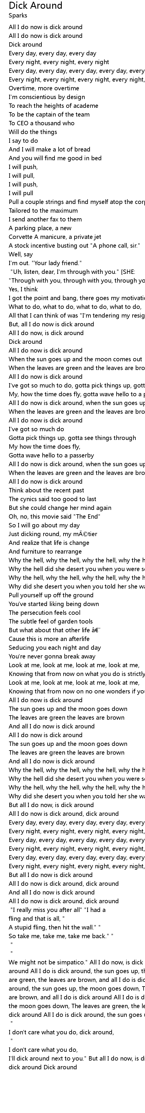 | We might not be simpatico." All I do now, is dick around All I do now, is dick around All I do is dick around, the sun goes up, the moon goes down, The leaves are green, the leaves are brown, and all I do is dick around All I do is dick around, the sun goes up, the moon goes down, The leaves are green, the leaves are brown, and all I do is dick around All I do is dick around, the sun goes up, the moon goes down, The leaves are green, the leaves are brown, and all I do is dick around All I do is dick around, the sun goes up, the moon goes down, The leaves are green, the leaves are brown, and all I do is dick around [SHE:] " | |