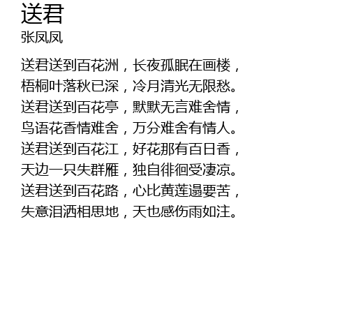 | [00:20.12] | sòng jūn sòng dào bǎi huā zhōu, cháng yè gū mián zài huà lóu, |