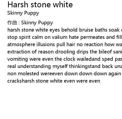 | harsh stone white eyes behold bruise baths soak crying bones everydays appeal to stop spirit calm on valium hate permeates and fills the airicy clouds the atmosphere illusions pull hair no reaction how wasthis done it exists by extraction of reason drooling drips the bileof sanity through the thought lines vomiting were even the clock wailedand sped past two tic tic toc in time in the real understanding myself thinkingstand back unafraid and unaffected stand back non molested wereeven down down down again down here in the cracks face hidden cracksharsh stone white even were even |