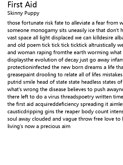 those fortunate risk fate to alleviate a fear from withinclawing to trust someone monogamy sits uneasily ice that don't heatfreeze howl hollow howl in vast space all light displaced we can killdesire albatross worn subvert to twist and old poem tick tick tick ticktick altruistically we've come a long way man and woman raping fromthe earth worming what it's worth right wing ricochet displaysthe evolution of decay just go away infant hospital winged protectioninfected the new born dreams a life that cannot be intuitive greasepaint drooling to relate all of lifes mistakes hitting in the faceorchard putrid smile head of state state headless states of being asright up against what's wrong the disease believes to push awaynormality alone with virtue what's there left to do a virus threadspoetry written time dogmatically lifes plague the first aid acquireddeficiency spreading it aimlessly have heart crash course causticdripping gins the reaper body count intensify getting weaker moistenthe soul away clouded and vague throw free love to history masters ofnothing living's now a precious aim |