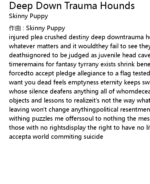 | injured plea crushed destiny deep downtrauma hounds run to corrode integrity whatever matters and it wouldthey fail to see they make believe reality helpless deathsignored to be judged as juvenile head caves in growing pains no timeremains for fantasy tyrrany exists shrink beneath the ingrown thorns forcedto accept pledge allegiance to a flag tested to forget you mustresist they want you dead feels emptyness eternity keeps swallowingdigested benefactors whose silence deafens anything all of whomdecease and miss to pierce a point objects and lessons to realizeit' s not the way what' s the point of giving up leaving won' t change anythingpolitical resentment to push away all growth withing puzzles me offerssoul to nothing the message screams it' s purity that those with no rightsdisplay the right to have no life do have respect they must accepta world commiting suicide |