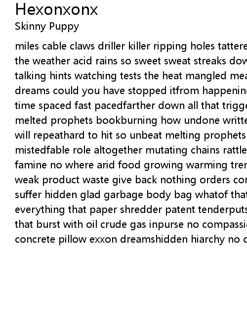 miles cable claws driller killer ripping holes tattered cloth stainedregaining the weather acid rains so sweet sweat streaks downpouron humidity colder time talking hints watching tests the heat mangled meatretaliate no blaming in future dreams could you have stopped itfrom happening best left spectator spectacle time spaced fast pacedfarther down all that trigger guaging cause kills at will melted prophets bookburning how undone written slurs the meaning the past they will repeathard to hit so unbeat melting prophets the past melting undone mistedfable role altogether mutating chains rattle happy to perform eitherwar or famine no where arid food growing warming trends a place passivecows to feed the weak product waste give back nothing orders come inmake a million living things suffer hidden glad garbage body bag whatof that change that could save everything that paper shredder patent tenderputs us back in time again budgets that burst with oil crude gas inpurse no compassion common criminals seek asylum concrete pillow exxon dreamshidden hiarchy no one in power taking blame |