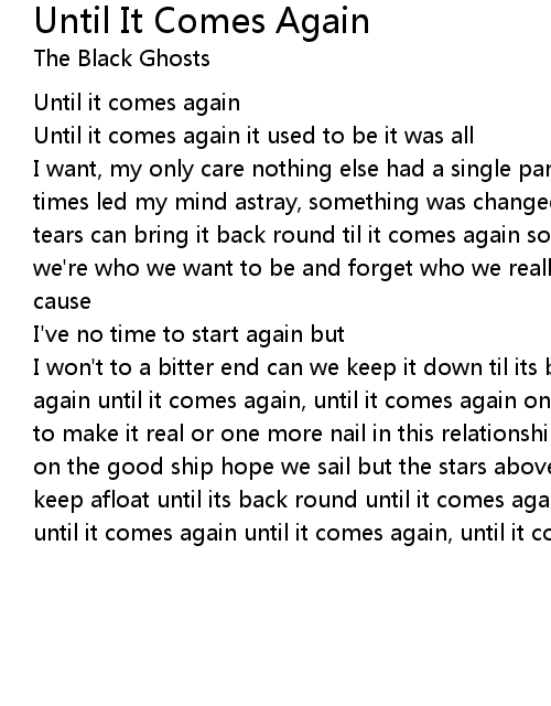 I won't to a bitter end can we keep it down til its back round til it comes again until it comes again, until it comes again one more time to take the test to make it real or one more nail in this relationship make it impossible to heal on the good ship hope we sail but the stars above say the wind will fail can we keep afloat until its back round until it comes again until it comes again, until it comes again until it comes again, until it comes again |