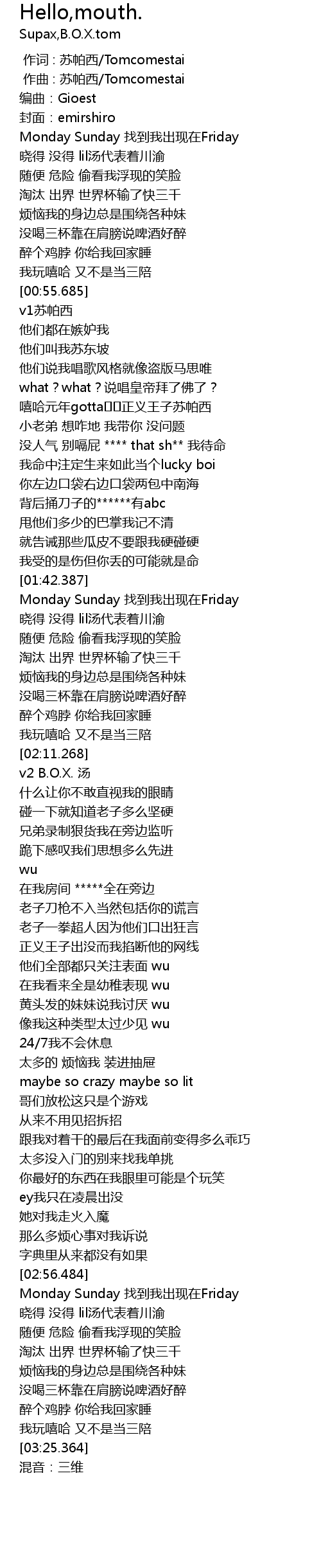 | [02:56.986] | Monday Sunday zhao dao wo chu xian zai Friday |