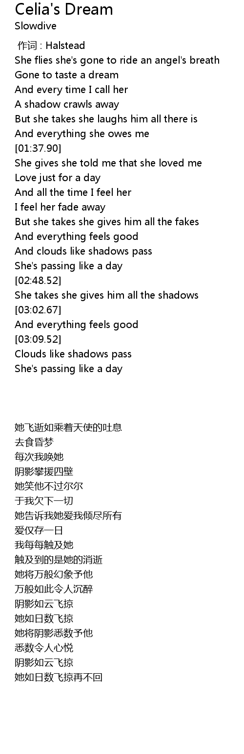 | [00:40.92] | She flies she's gone to ride an angel's breath |
