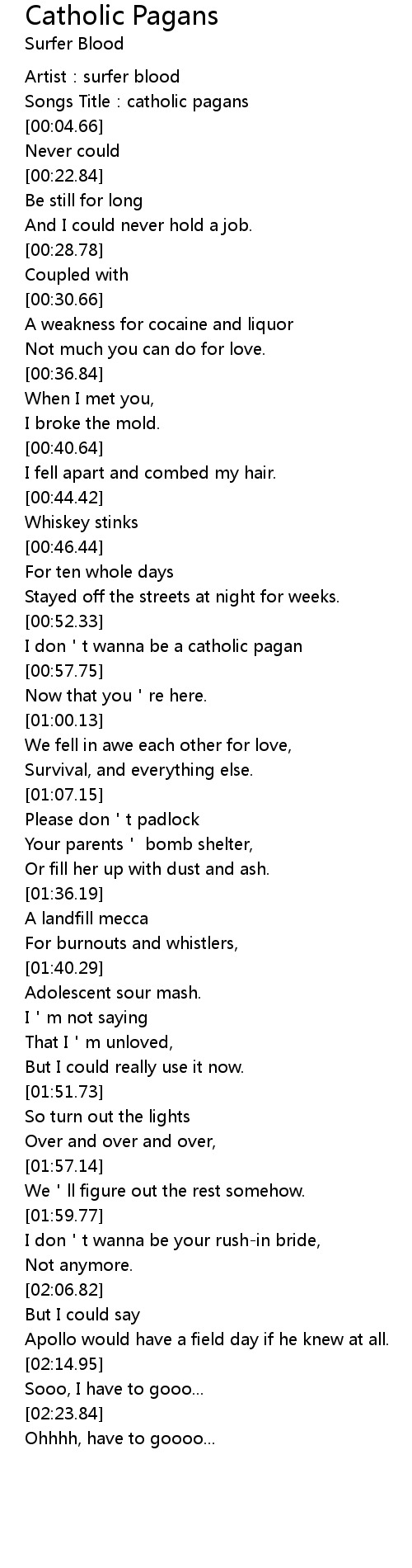 | [00:55.02] | I don't wanna be a catholic pagan |