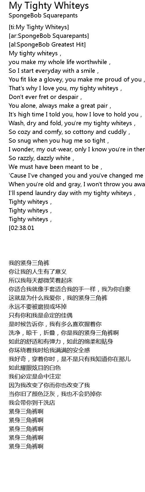 | [00:31.94] | That' s why I love you, my tighty whiteys, |