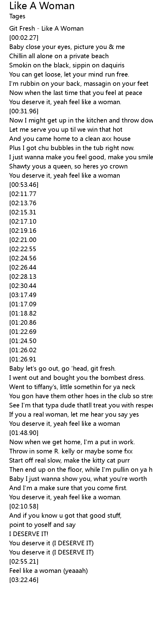 | [00:27.38] | You deserve it, yeah feel like a woman. |