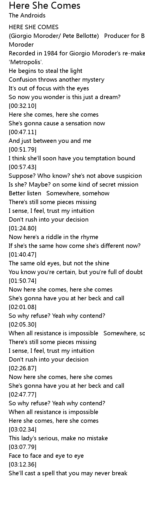 Here she comes, here she comes |