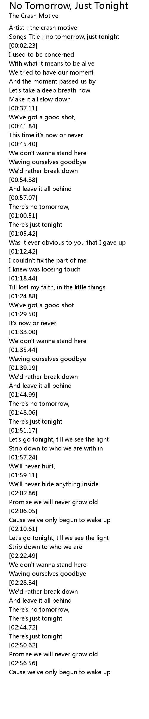 | [00:01.49] | Songs Title: no tomorrow, just tonight |