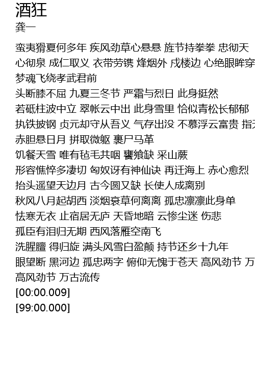 | [04:59.95] | 洗腥膻 得归旋 满头风雪白盈颠 持节还乡十九年 眼望断 黑河边 孤忠两字 俯仰无愧于苍天 高风劲节 万古流传 高风劲节 万古流传 |