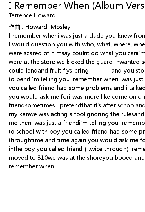 | I would question you with who, what, where, whentrue thought there inbut you were scared of himsay coulnt do what you cani'm telling youi remember whenwe were at the store we kicked the guard inwanted somthing more than food stamps could lendand fruit flys bring ________and you stole we ranthe rules just have to bendi'm telling youi remember wheni was just a dude walked to school with boy you called friend had some problems and i talked you throughtime and time again you would ask me fori was more like come on climb inthe boy you called friendsometimes i pretendthat it's after schooland your in the room with me and my kenwe was acting a foolignoring the rulesand you were kinda himand you told me theni was just a friendi'm telling youi remember wheni was just a dude walked to school with boy you called friend had some problems and i talked you throughtime and time again you would ask me fori was more like come on climb inthe boy you called friend ( twice through)i remember whenthe night before you moved to 310we was at the shoreyou booed and cried thendo or dieingyou promisedi remember when |