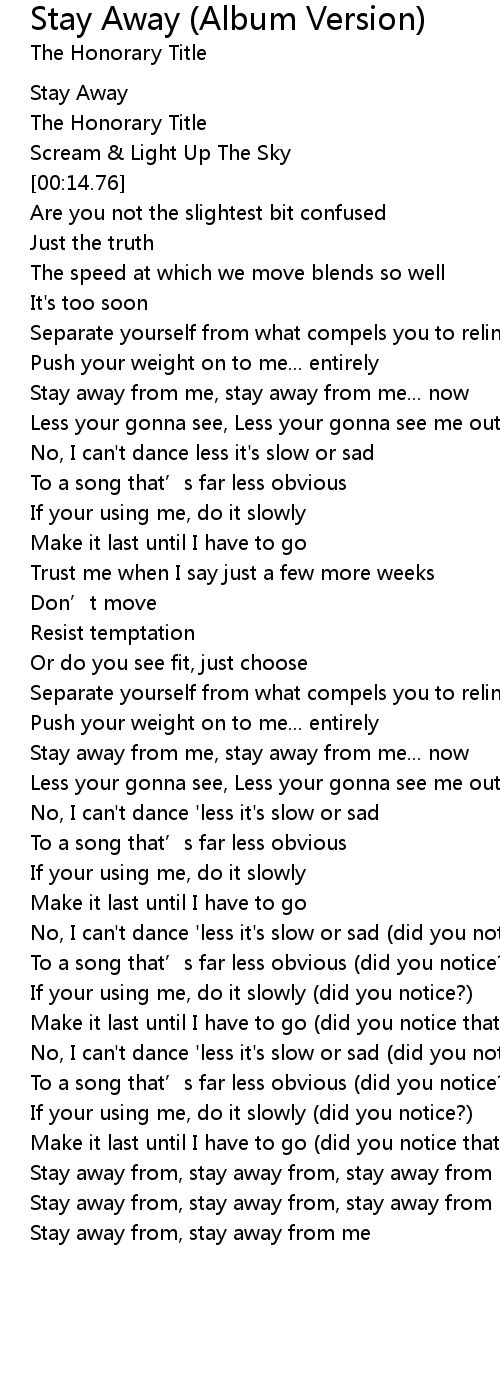 | [03:47.84] | Stay away from, stay away from, stay away from me |