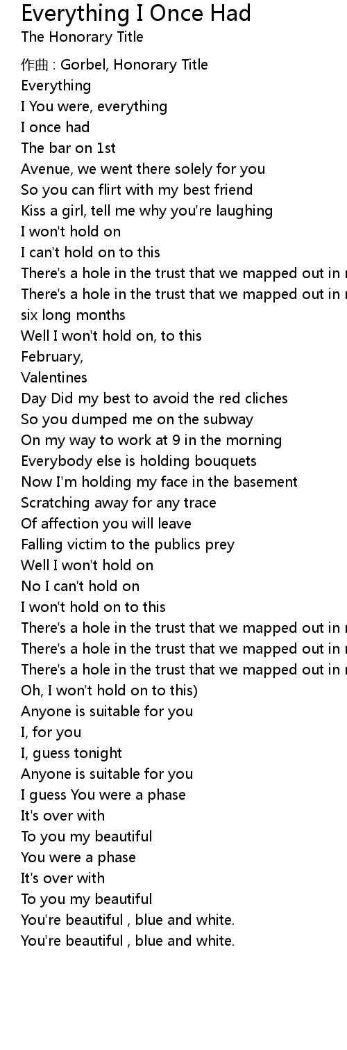 | There' s a hole in the trust that we mapped out in my bed for six long months Oh, I won' t hold on to this | |