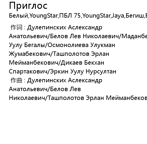 | [00:00.00-1] | 作曲 : Дулепинских Аслександр Анатольевич/Белов Лев Николаевич/Ташполотов Эрлан Мейманбекович |