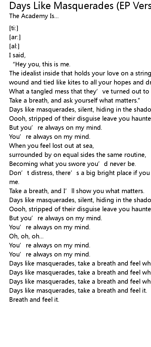 | [02:52.87] | Days like masquerades, take a breath and feel what matters. |