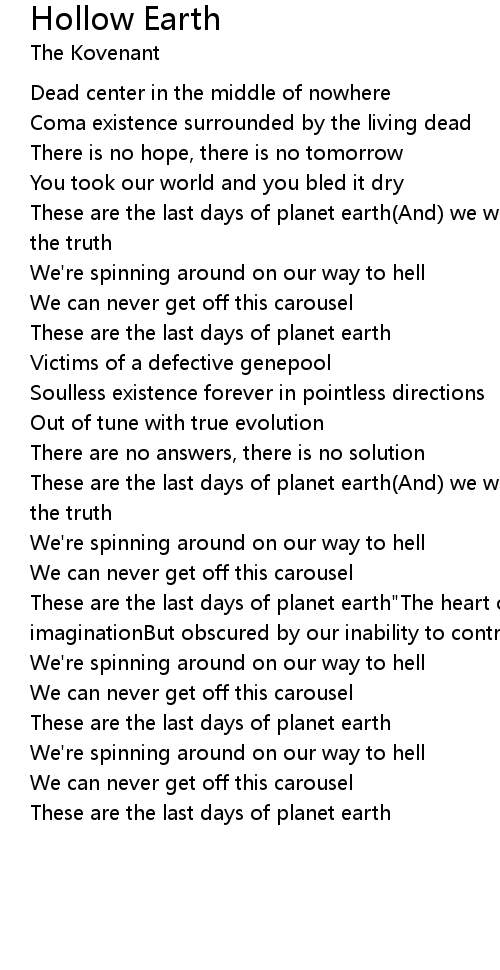 These are the last days of planet earth"The heart of a mystery is seen through imaginationBut obscured by our inability to control chaos " |