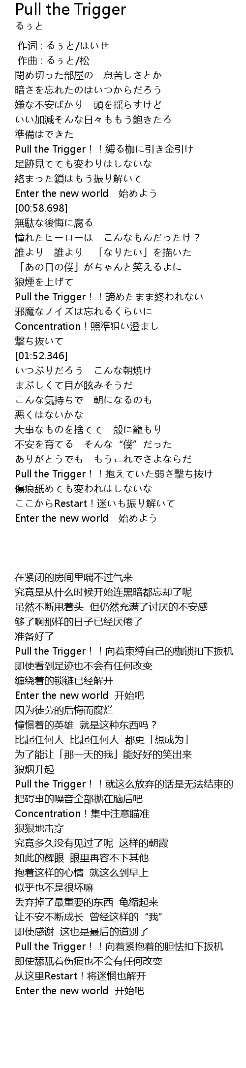 | [01:33.537] | Pull the Trigger!! dì zhōng |
