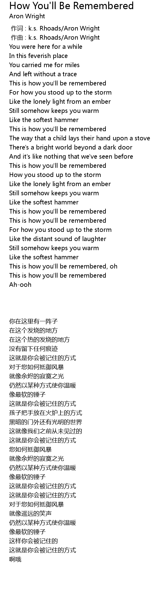 | [03:36.78] | This is how you' ll be remembered, oh |