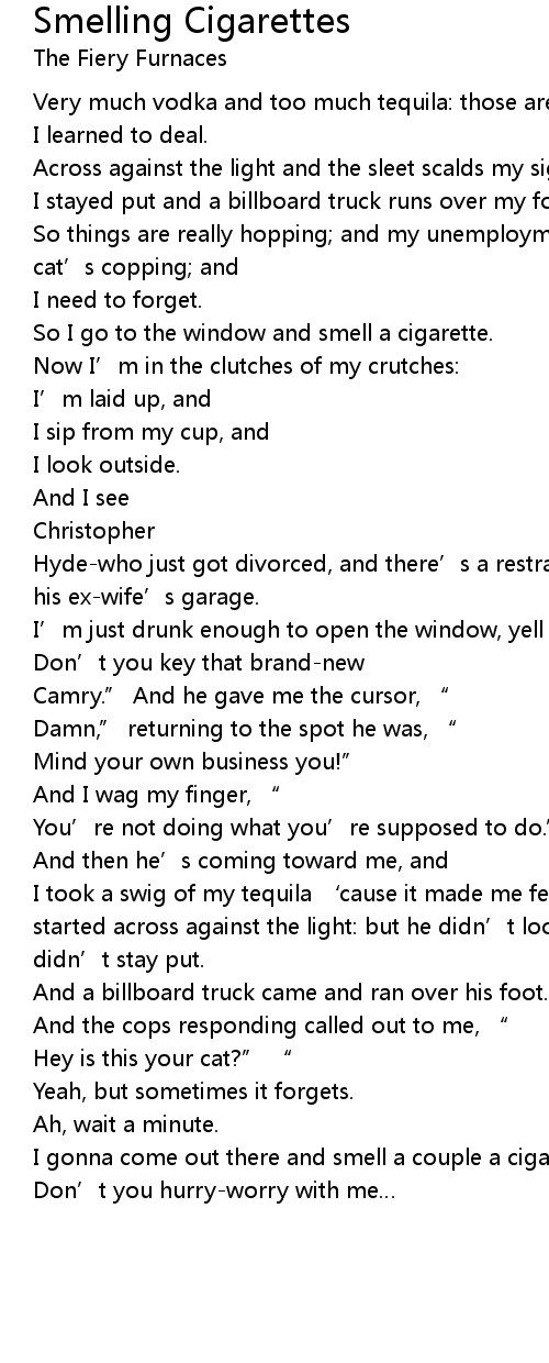 | I gonna come out there and smell a couple a cigarettes.” | |