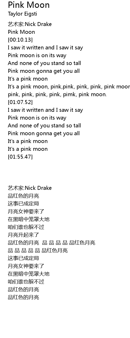 | [00:38.13] | It' s a pink moon, pink, pink, pink, pink, pink moon. |