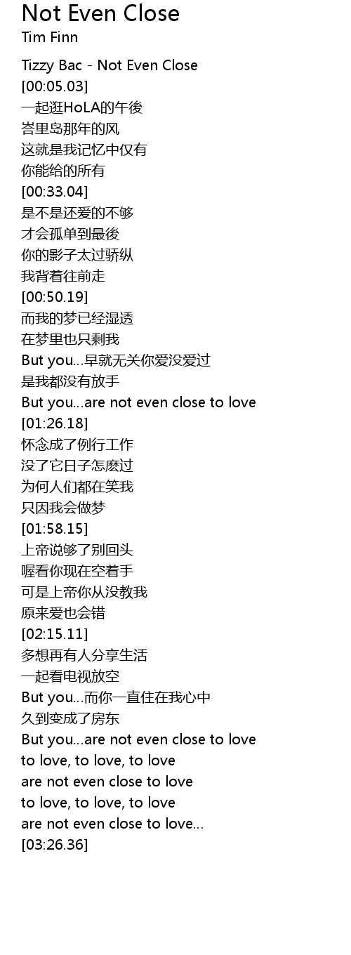 | [00:00.22] | Tizzy Bac - Not Even Close |