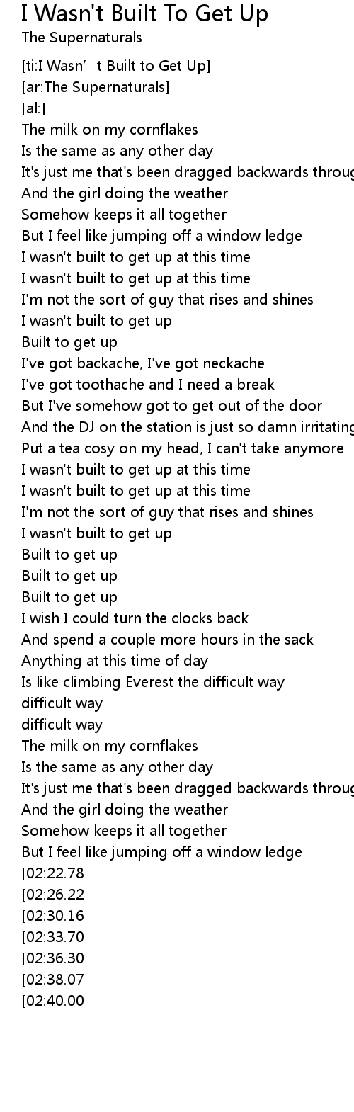 | [02:41.68][02:22.78] | I wasn' t built to get up at this time |