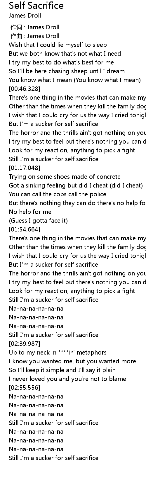 | [02:36.748] | Still I'm a sucker for self sacrifice |