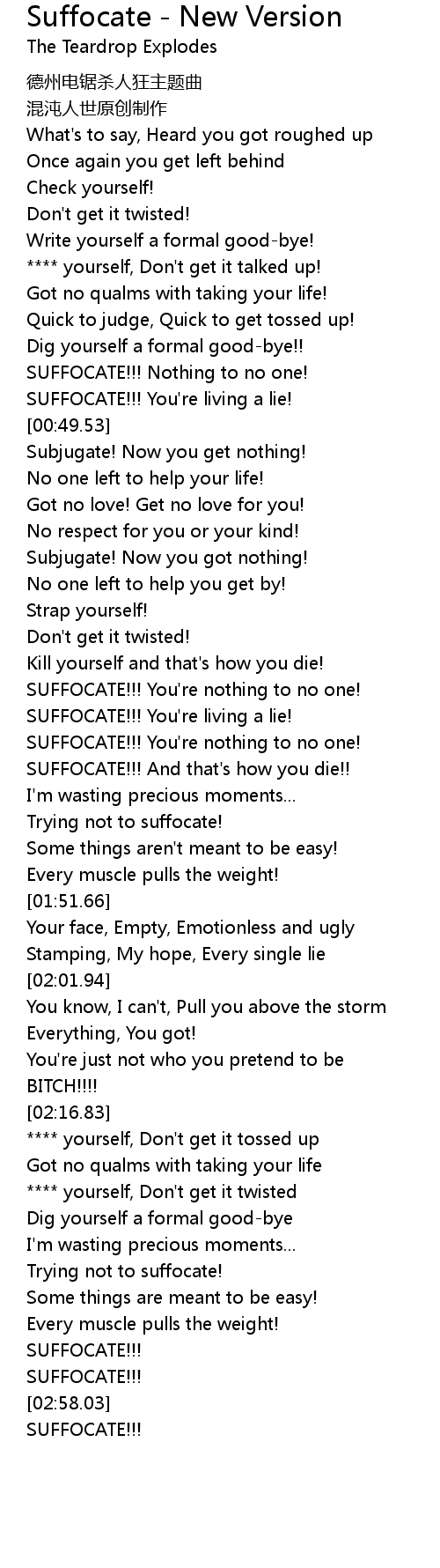 | [00:44.63] | SUFFOCATE!!! You' re living a lie! |