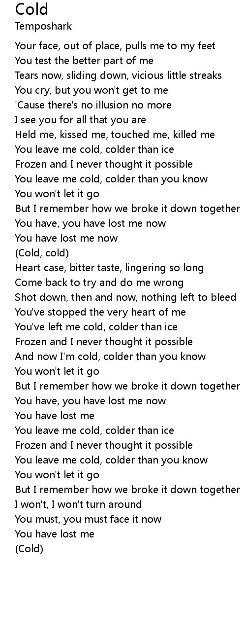 And now I'm cold, colder than you know |
