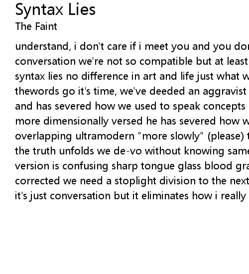 | understand, i don't care if i meet you and you don't care if we meet it's just conversation we're not so compatible but at least we know and we don't care syntax lies no difference in art and life just what we say and the order thewords go it's time, we've deeded an aggravist one that wouldn't make us laugh and has severed how we used to speak concepts of language around his waist but more dimensionally versed he has severed how we used to speak call it backwards overlapping ultramodern "more slowly" (please) they mistook it for religion but the truth unfolds we de-vo without knowing same language = same story the new version is confusing sharp tongue glass blood grammar its comedic we're corrected we need a stoplight division to the next calendar...year i understand it's just conversation but it eliminates how i really feel. |